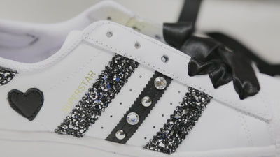 Sneakers originali Adidas Superstar personalizzate a mano con applicazioni di glitter black silver, strass e cuore in pelle nera sulle pareti laterali e tallone. Lacci in raso nero.