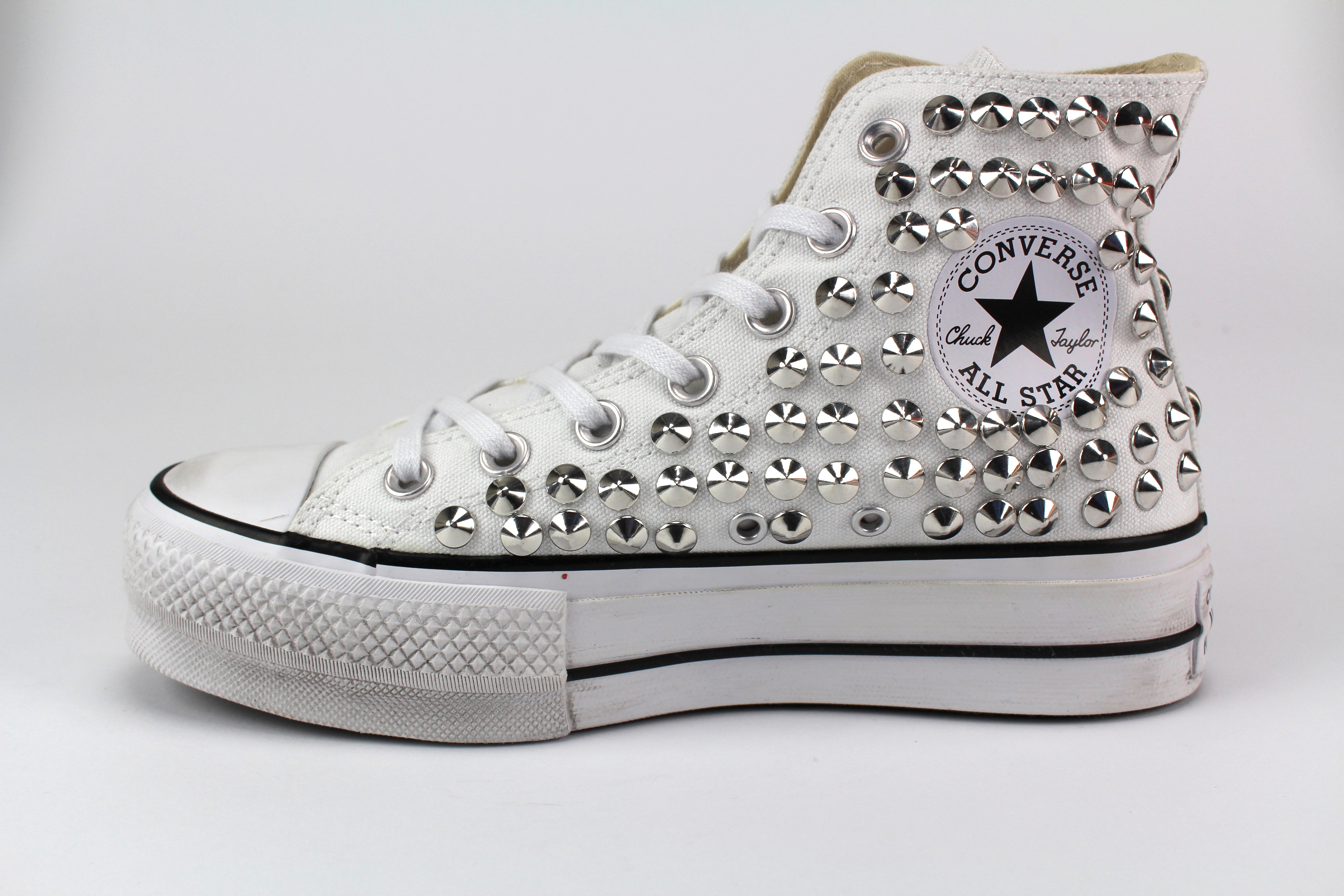 Scarpe originali Converse All Star Platform bianche personalizzate a mano con applicazione di borchie sulle pareti laterali della sneakers e borchie a teschio sul tallone. Effetto sporcato.