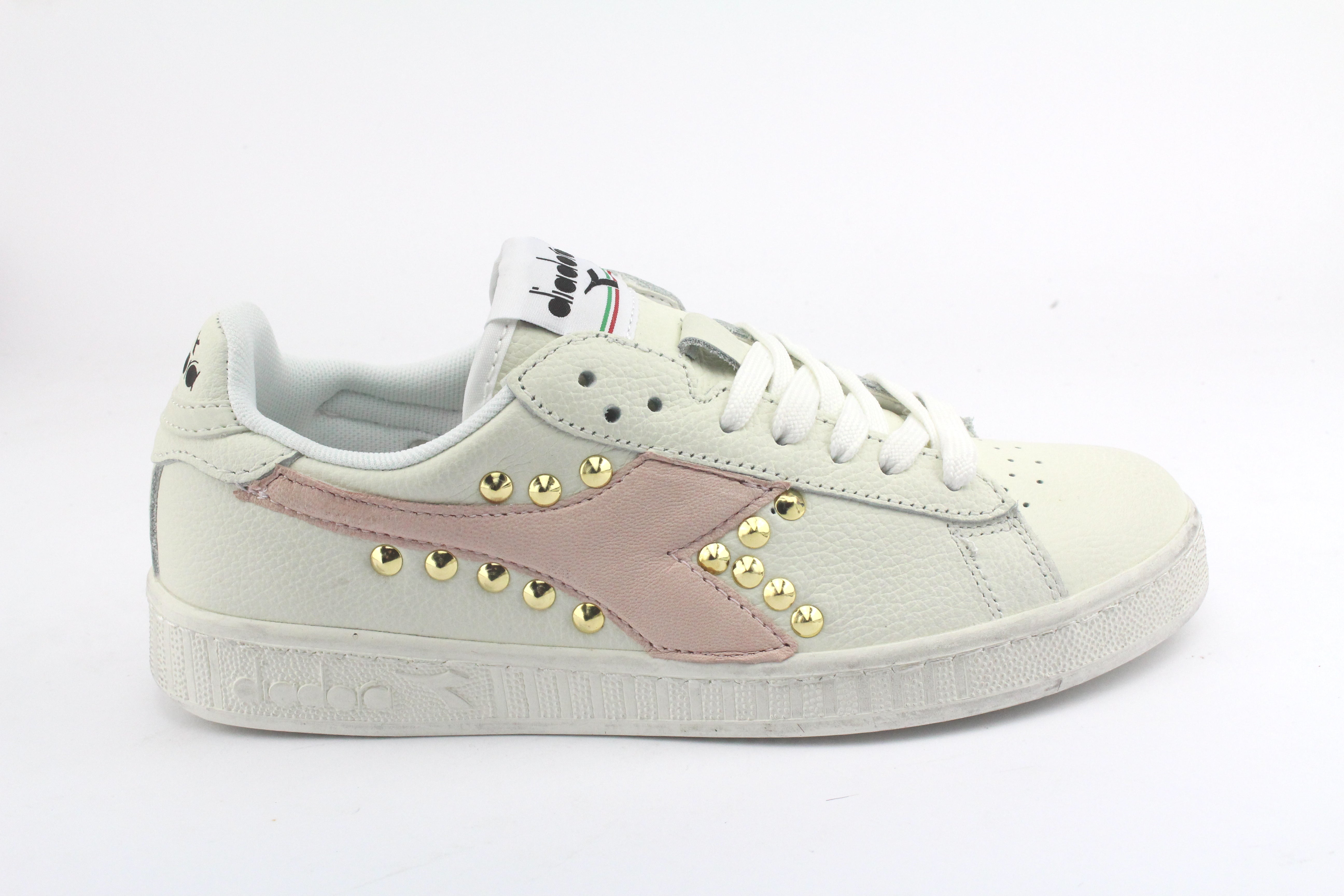Sneakers originali Diadora L High Waxed Basse personalizzate a mano con applicazione di logo Diadora in pelle Rosa con aggiunte borchie oro.