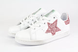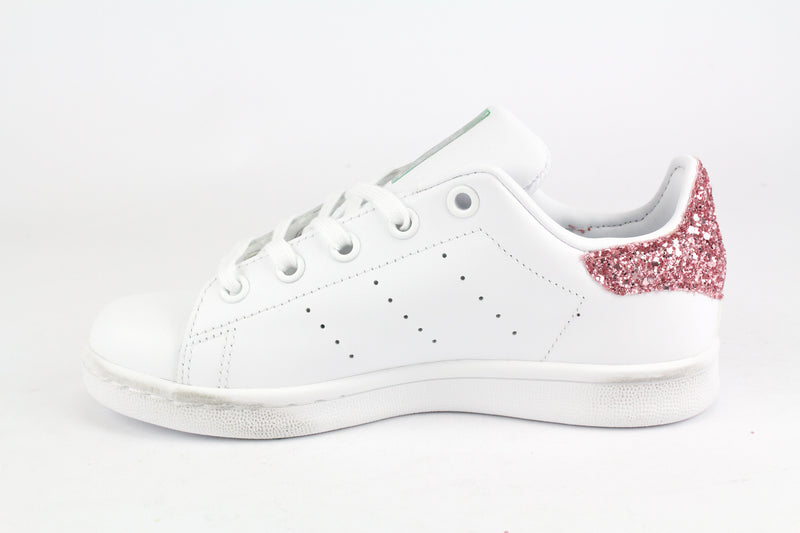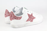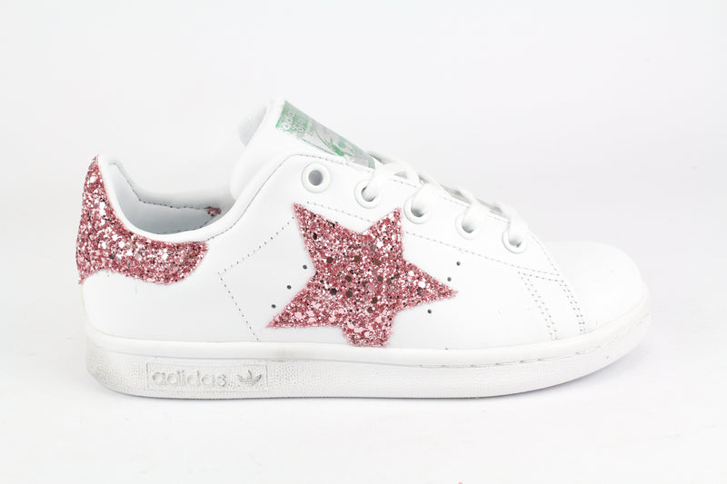 Scarpe originali Adidas Stan Smith per bambino personalizzate a mano con applicazioni di una stella glitter rosa sulle pareti laterali e tallone ricoperto in glitter dello stesso colore.