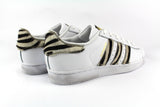 Scarpe originali Adidas Superstar personalizzate a mano con applicazioni di cavallino zebrato cucite sulle bande laterali e sul tallone della sneaker. Suola con effetto sporcato.