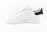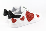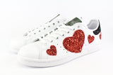 Scarpe originali Adidas Stan Smith personalizzate a mano con applicazione di cuori rossi glitter di varie dimensioni sulle pareti laterali e tallone ricoperto di glitter black silver.
