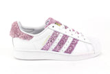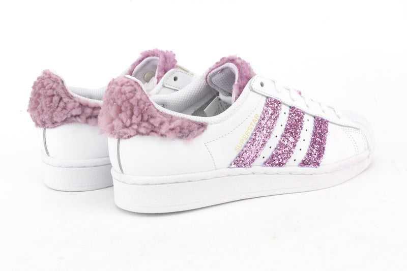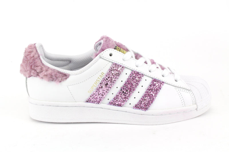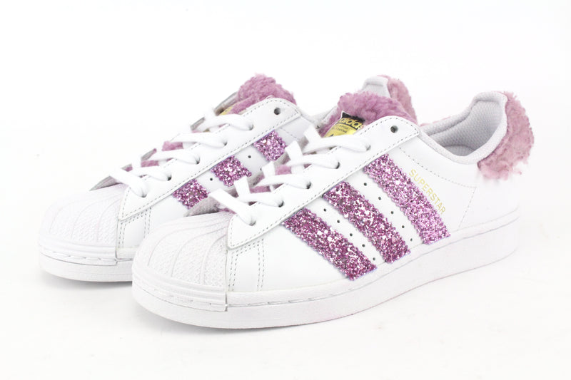 Sneakers originali Adidas Superstar personalizzate a mano con applicazioni di Lamb Rosa nel tallone e linguetta, Glitter Rosa sulle bande.