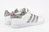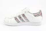 Scarpe originali Adidas Superstar personalizzate a mano con applicazione di glitter argento sul tallone e pareti laterali e spruzzi di vernice fucsia e nero sopra i glitter.