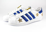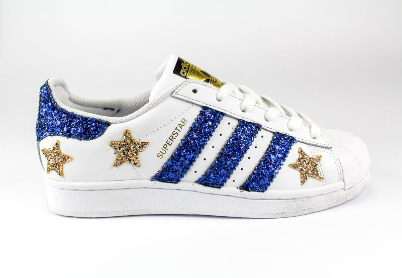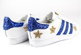 Scarpe originali Adidas Superstar personalizzate a mano con bande laterali e tallone rivestite in glitter bluette e applicazione di stelline in glitter oro su entrambe le pareti della sneaker.