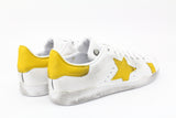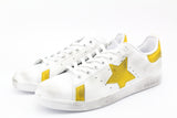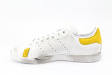 Scarpe originali Adidas Stan Smith personalizzate a mano con applicazione di stella in pelle gialla e pelle gialla su tallone e parete laterale. Effetto sporcato.