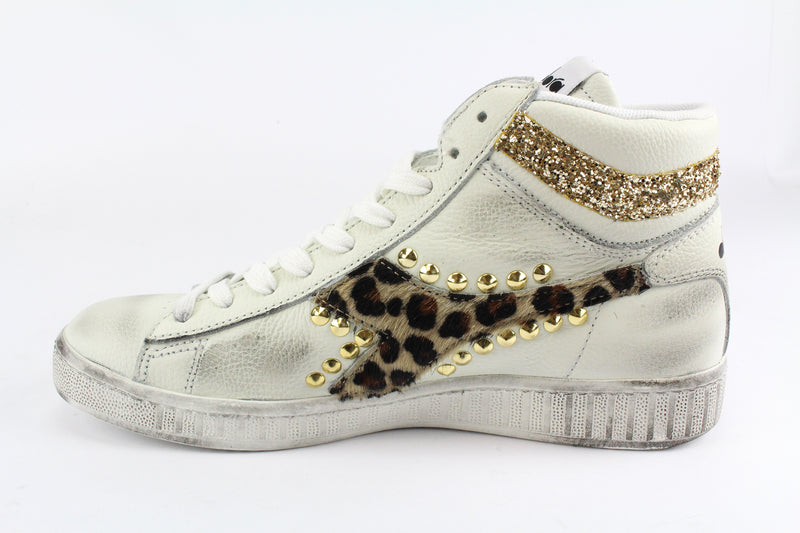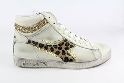 Scarpe originali Diadora L High Waxed personalizzate a mano con applicazione di cavallino maculato, glitter oro e borchie oro sulle pareti della sneaker. Suola con effetto sporcato.