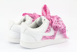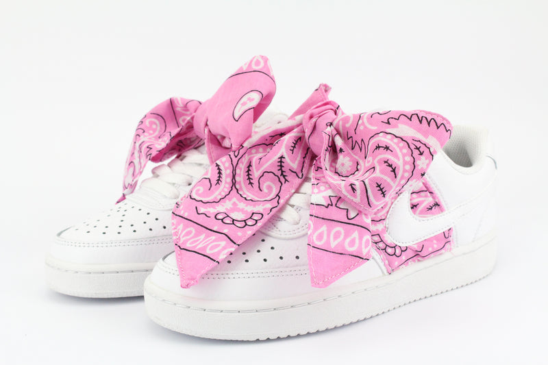 Scarpe originali Nike Court Vision Low personalizzate a mano con applicazione di bandana in stoffa colore rosa che forma un fiocco regolabile sui lacci della sneakers.